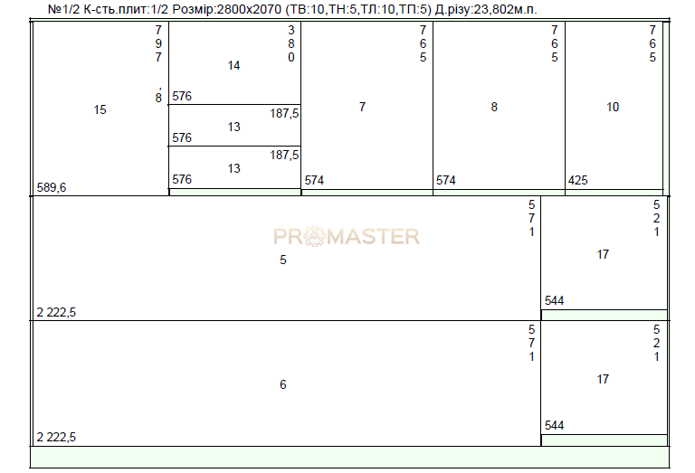 Деталировка представляет собой таблицу, содержащую пильные размеры всех деталей. Это значит, что в размерах не учтена толщина кромки. Такая таблица содержит также информацию о сторонах деталей, на которые предусмотрено наклеивание кромки, а также о толщине этой кромки. Подобные таблицы составляются по группам материалов и фактически они являются техзаданием для производства.
